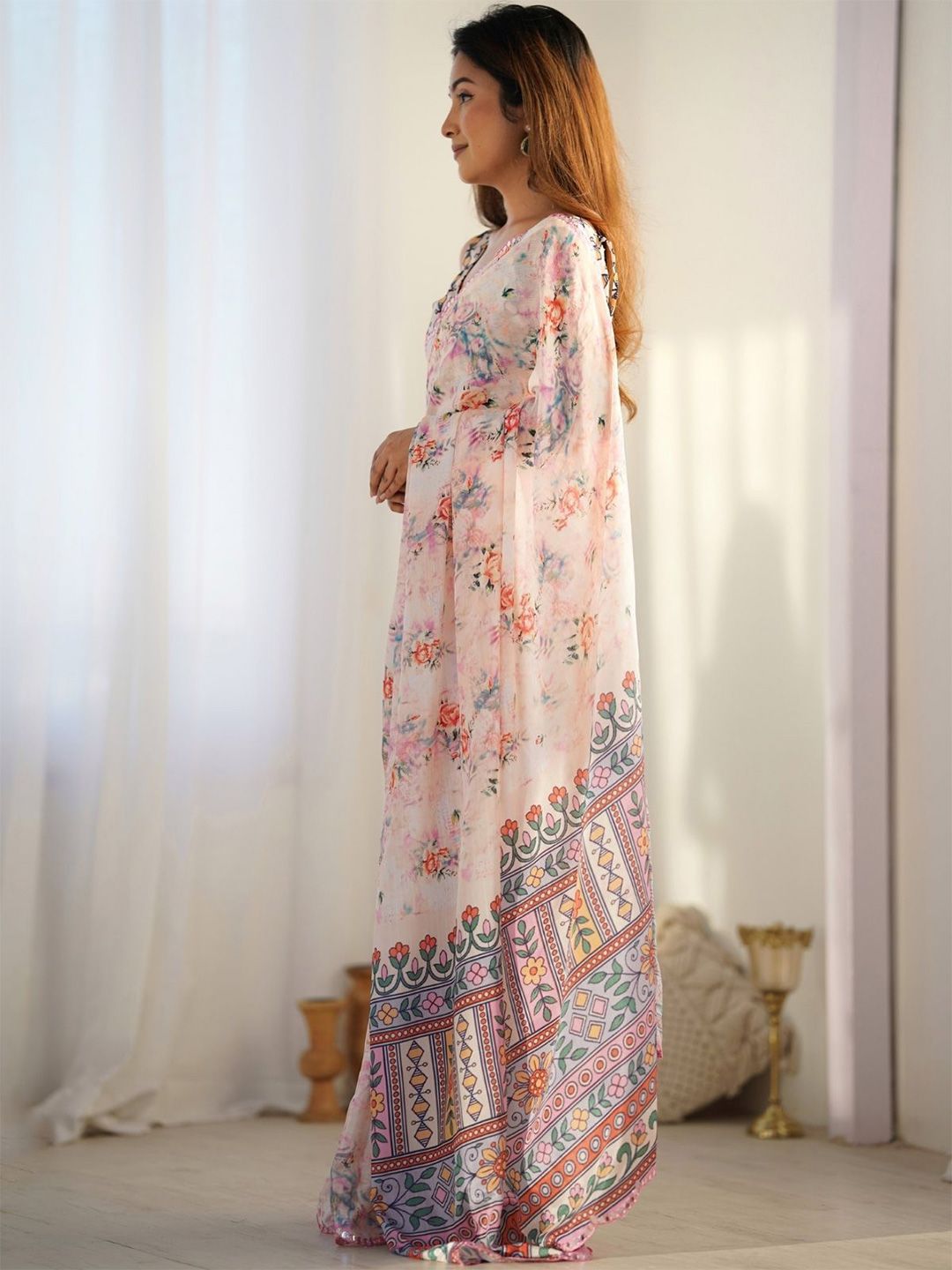 ODETTE Women Off White Chinon Printed Saree With Unstitched Blouse